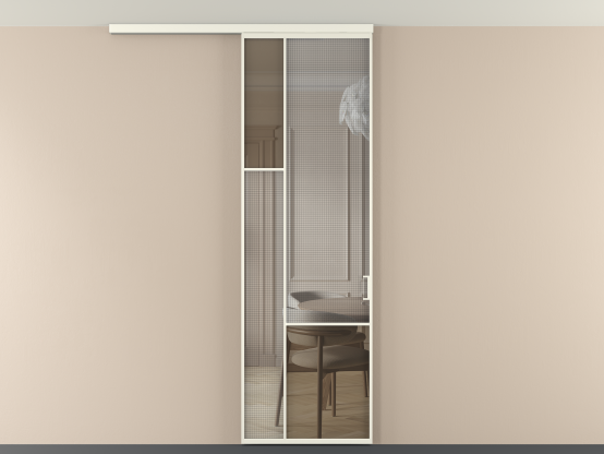 Во всех алюминиевых перегородках, независимо от типа установки, используется компланарный раздвижной механизм, благодаря которому декоративная крышка и полотно находятся в одной плоскости.